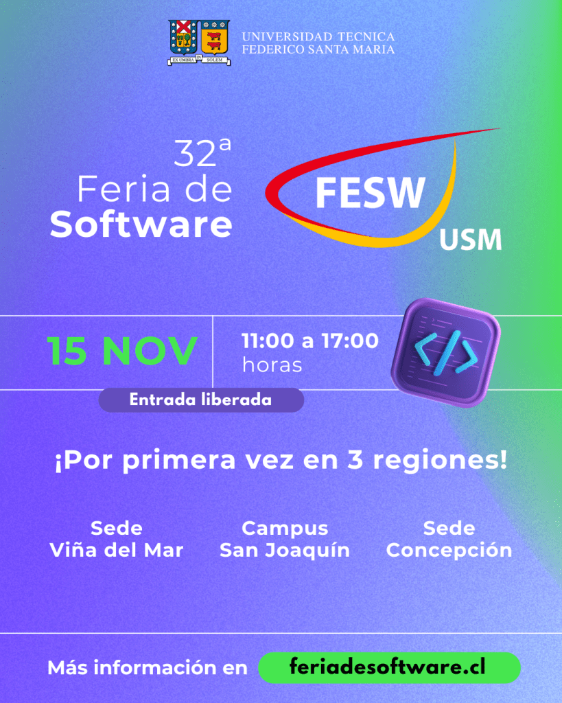 El Departamento de Informática les invita a participar de su tradicional Feria de Software, a realizarse el viernes 15 de noviembre entre 11:00 y 17:00 horas en Campus San Joaquín USM (Avenida Vicuña Mackenna #3939, Región Metropolitana). La exposición contará con 30 innovadores proyectos de software.