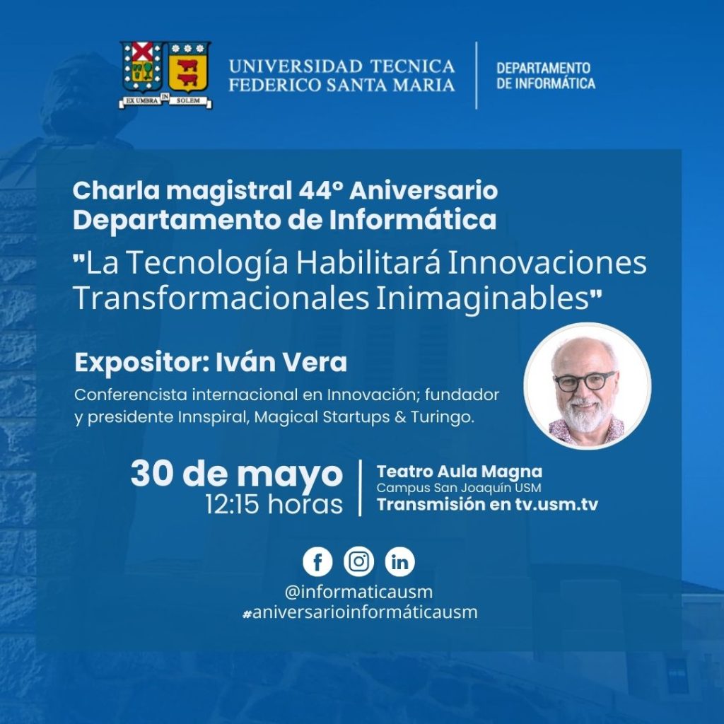 Invitamos a toda la comunidad a celebrar un nuevo aniversario del Departamento de Informática en la charla ”La Tecnología Habilitará Innovaciones Transformacionales Inimaginables”. Iván Vera, reconocido conferencista internacional en innovación nos presentará este tema contingente a nuestra disciplina.