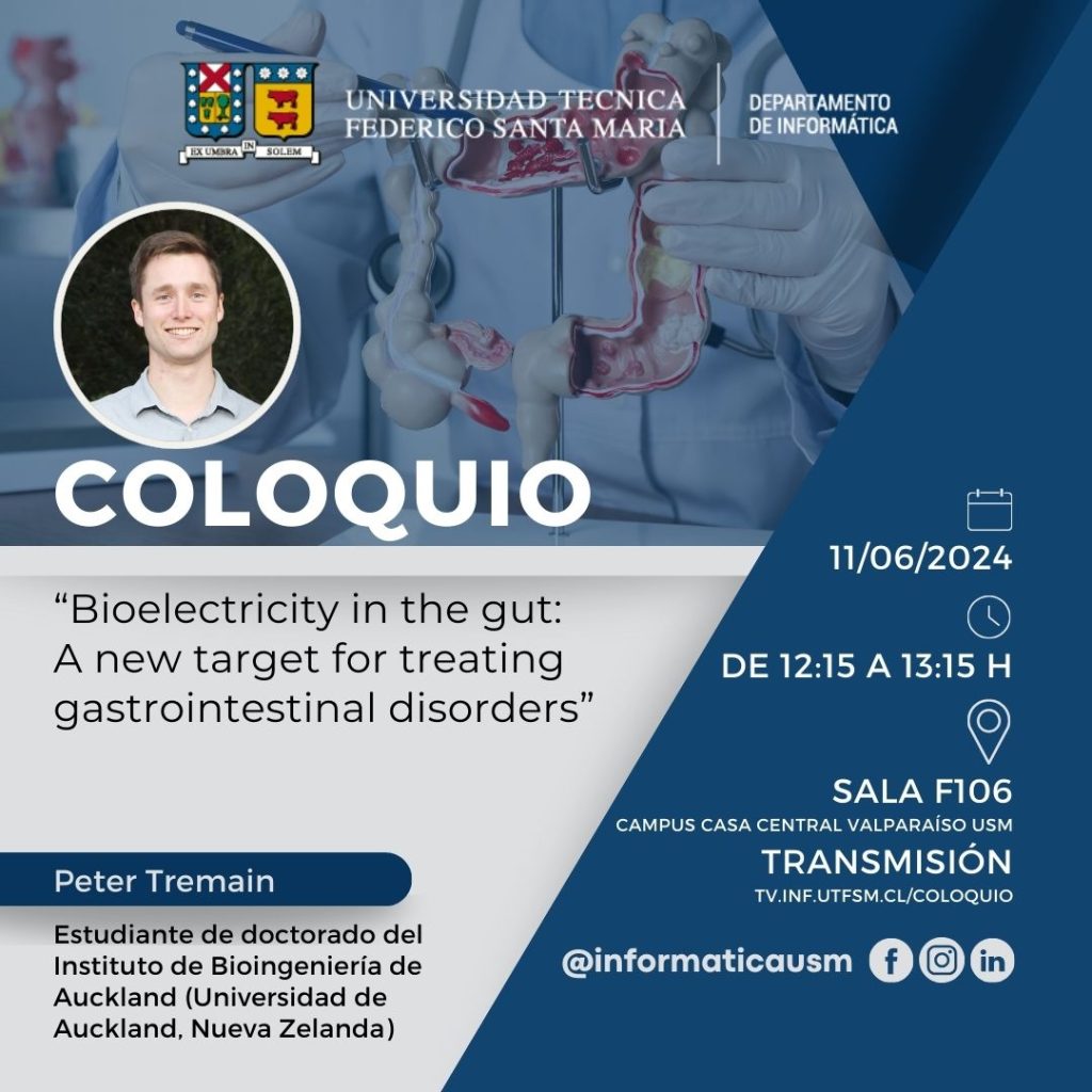 Se invita a la comunidad del Departamento de Informática a participar del Coloquio “Bioelectricity in the gut: A new target for treating gastrointestinal disorders”, a cargo de Peter Tremain, estudiante de doctorado del Instituto de Bioingeniería de Auckland (Universidad de Auckland, Nueva Zelanda).