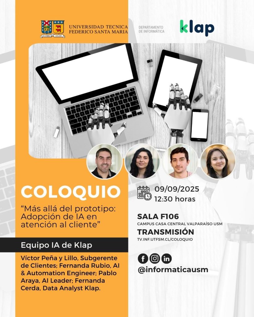 El Departamento de Informática invita a participar del coloquio “Más allá del prototipo: Adopción de IA en atención al cliente”, que presentará el equipo IA de Klap: Víctor Peña y Lillo, Subgerente de Clientes; Fernanda Rubio, AI & Automation Engineer; Pablo Araya, AI Leader; Fernanda Cerda, Data Analyst.