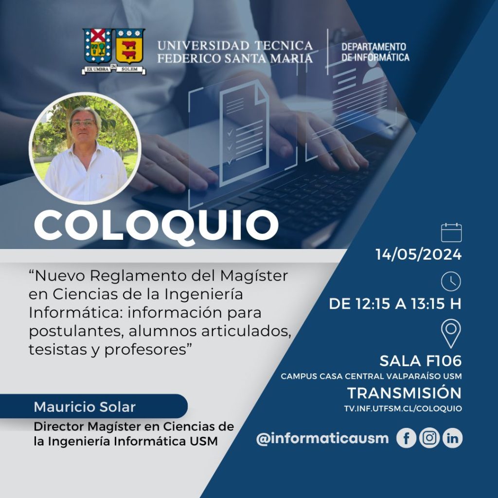 Se invita a la comunidad del Departamento de Informática a participar del Coloquio “Nuevo Reglamento del Magíster en Ciencias de la Ingeniería Informática: información para postulantes, alumnos articulados, tesistas y profesores”, a cargo de Mauricio Solar, director del programa. El evento se realizará de manera híbrida. Presencial en la sala F106, Campus Casa Central Valparaíso, con transmisión en www.tv.inf.utfsm.cl/coloquio.