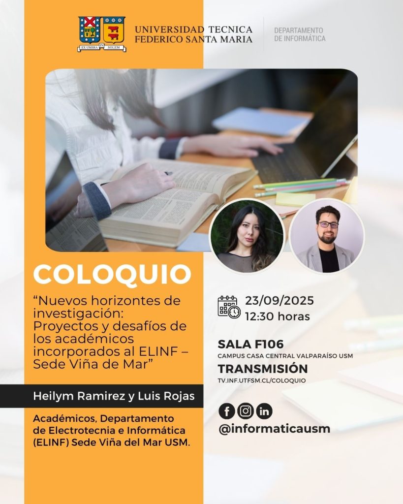 El Departamento de Informática invita a participar del coloquio “Nuevos horizontes de investigación: Proyectos y desafíos de los académicos incorporados al ELINF – Sede Viña de Mar”, que presentarán Heilym Ramirez y Luis Rojas, académicos del Departamento de Electrotecnia e Informática (ELINF) Sede Viña del Mar USM.