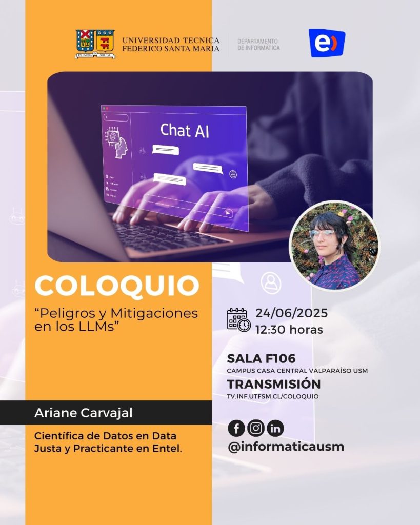 Se invita a la comunidad del Departamento de Informática y público en general a participar del coloquio “Peligros y Mitigaciones en los LLMs”, que presentará Ariane Carvajal, Científica de Datos en Data Justa y Practicante en Entel.