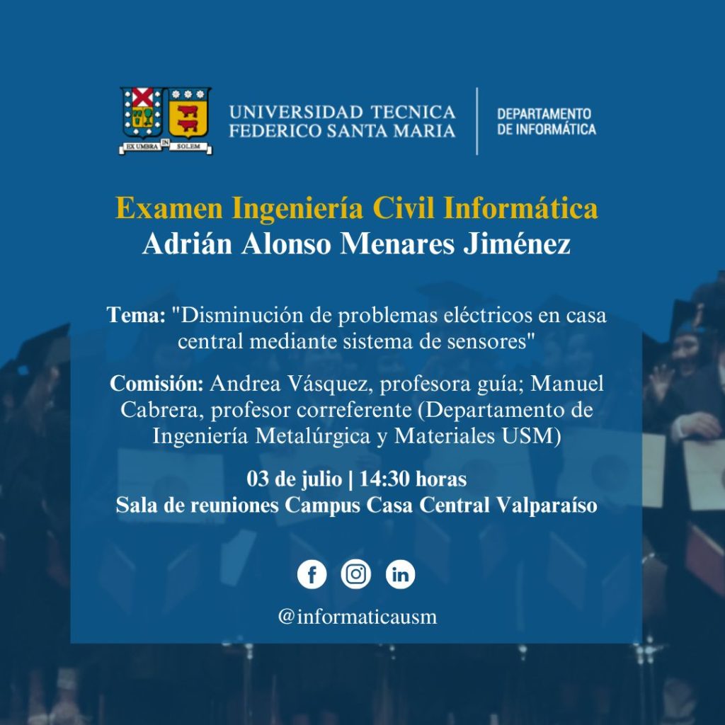 Se invita a presenciar el examen de título de Adrián Alonso Menares Jiménez, quien finaliza la carrera de Ingeniería Civil Informática con el tema de memoria “Disminución de problemas eléctricos en casa central mediante sistema de sensores”.