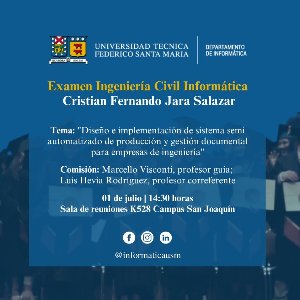 Se invita a presenciar el examen de título de Cristian Fernando Jara Salazar, quien finaliza la carrera de Ingeniería Civil Informática con el tema de memoria “Diseño e implementación de sistema semi automatizado de producción y gestión documental para empresas de ingeniería”.