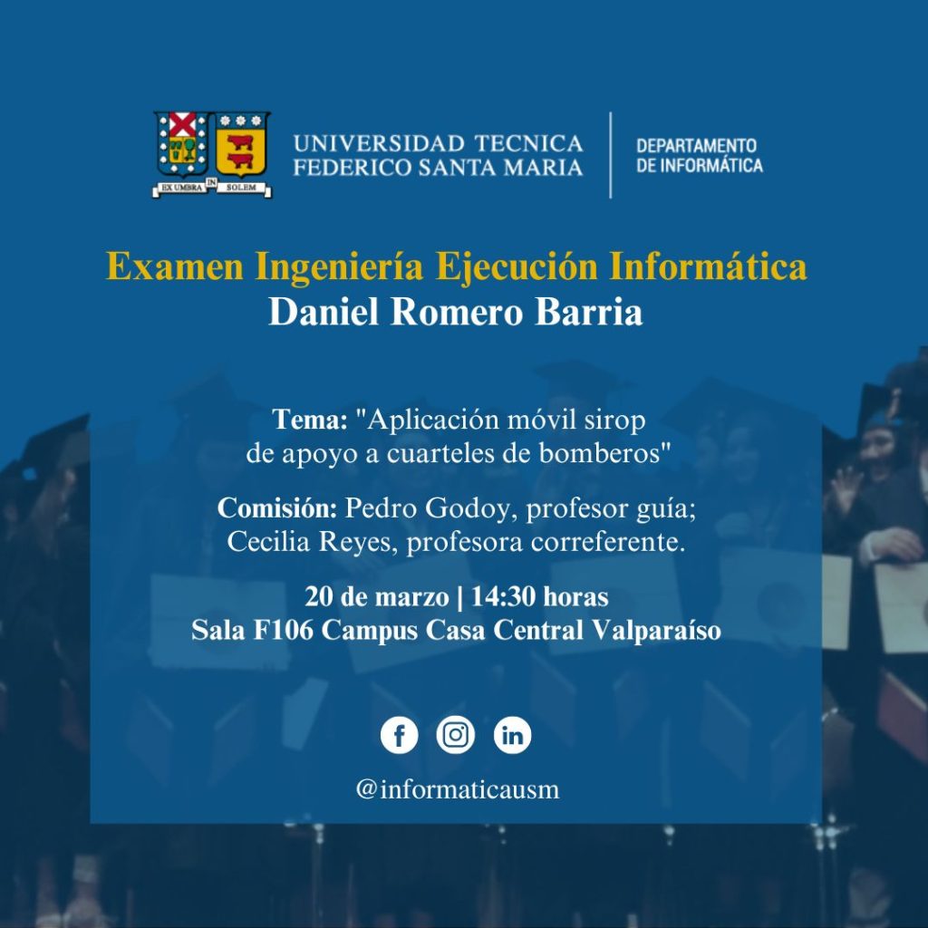Se invita a presenciar el examen de título de Daniel Romero Barria, quien finaliza la carrera de Ingeniería Ejecución Informática con el tema de memoria “Aplicación móvil sirop de apoyo a cuarteles de bomberos”.