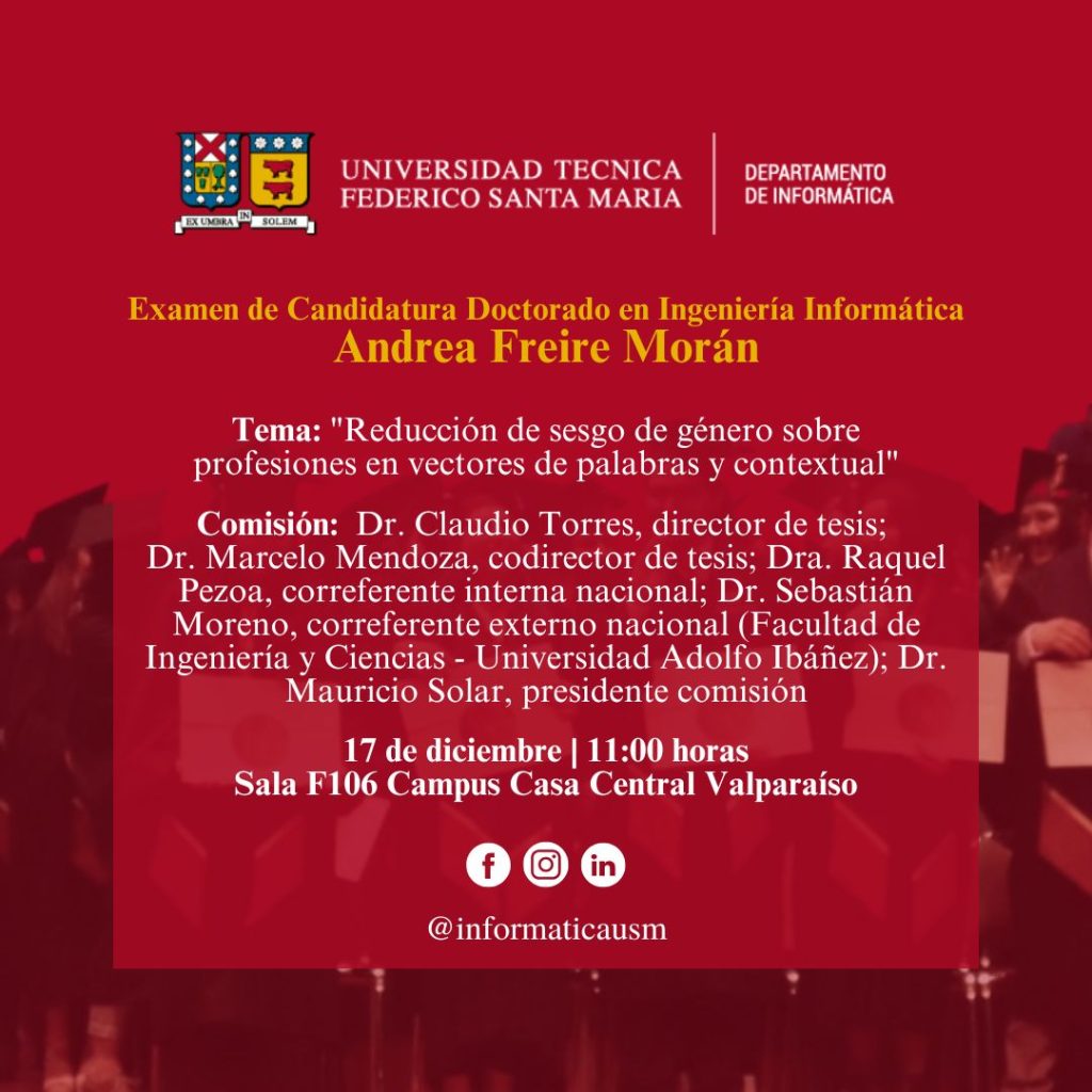 Se invita al examen de Candidatura Doctorado en Ingeniería Informática de Andrea Freire Morán, quien presentará el tema de tesis “Reducción de sesgo de género sobre profesiones en vectores de palabras y contextual”.