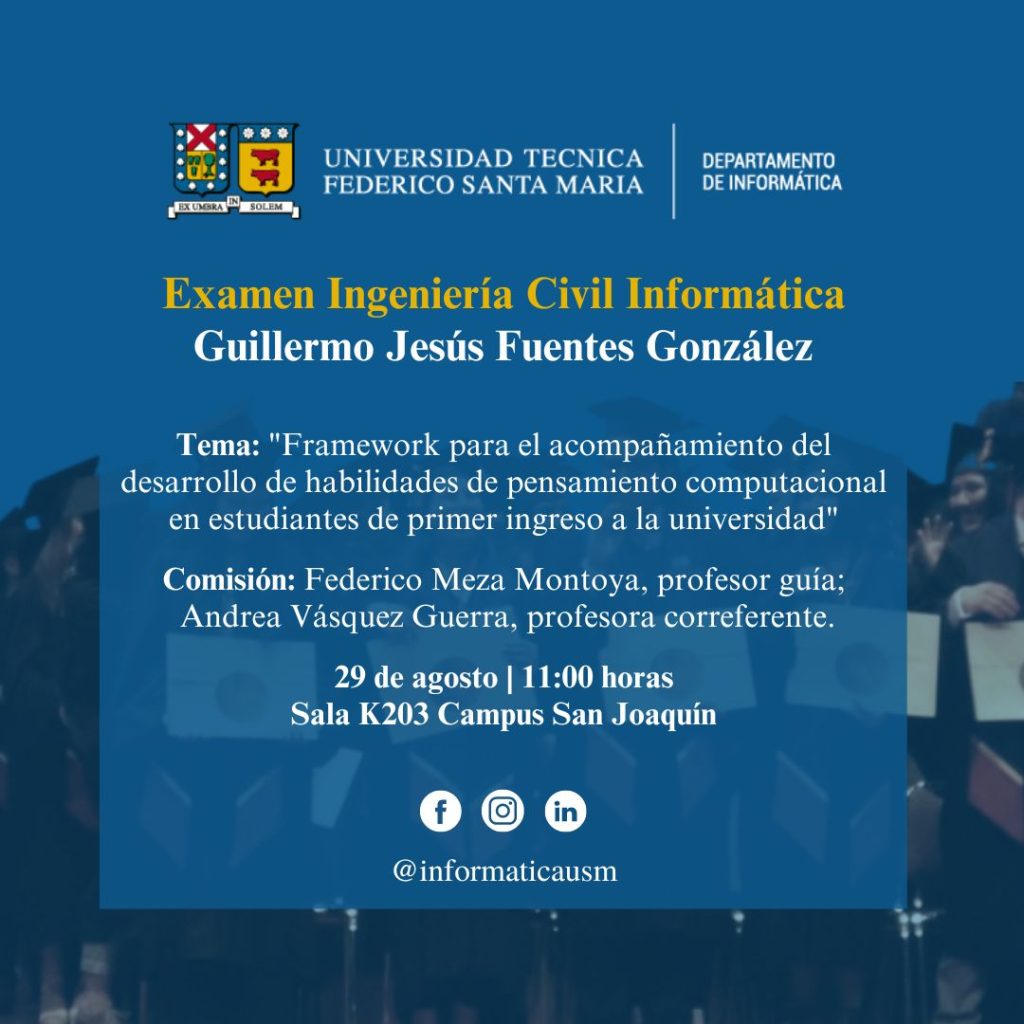 Se invita al examen de título de la carrera de Ingeniería Civil Informática de Guillermo Jesús Fuentes González, quien presentará el tema de memoria “Framework para el acompañamiento del desarrollo de habilidades de pensamiento computacional en estudiantes de primer ingreso a la universidad”.