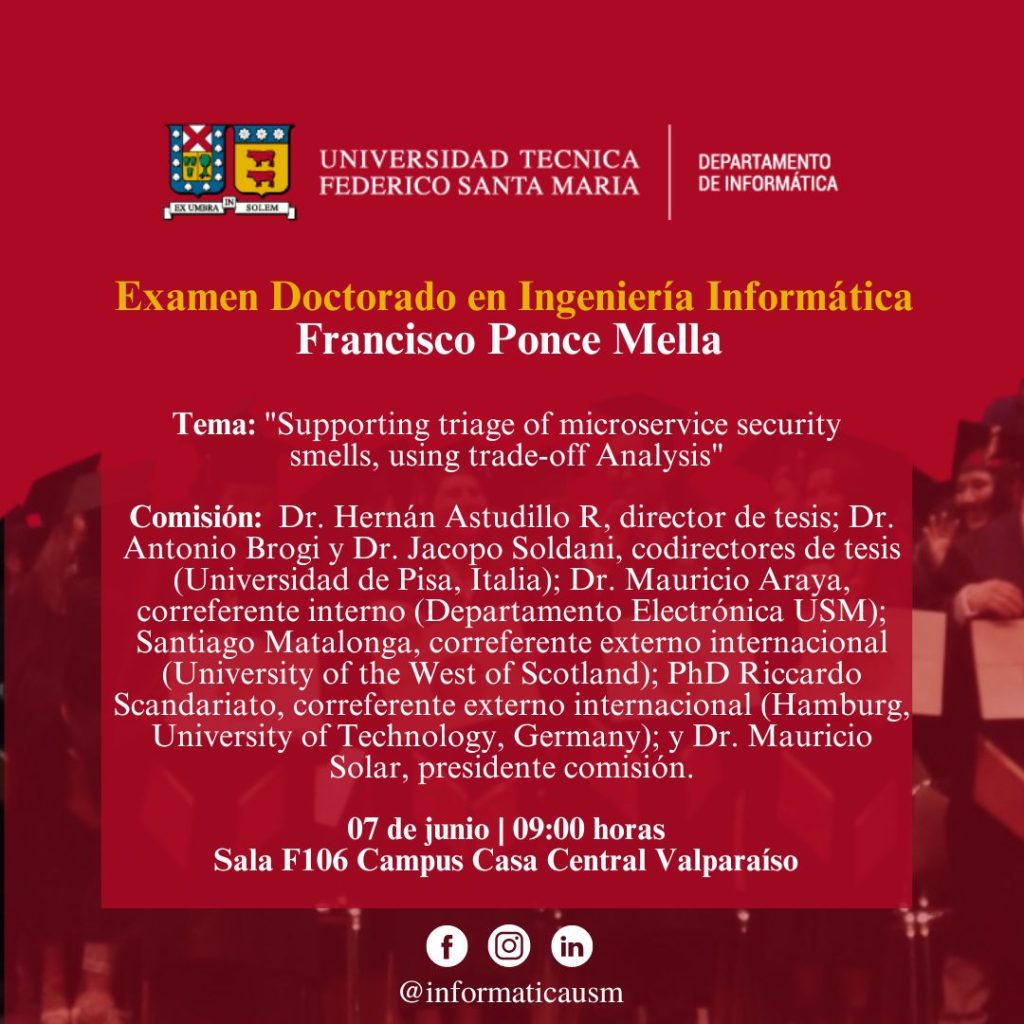 Se invita a presenciar el examen de grado de Francisco Ponce Mella, quien finaliza el programa de Doctorado en Ingeniería Informática con el tema “Supporting triage of microservice security smells, using trade-off Analysis”