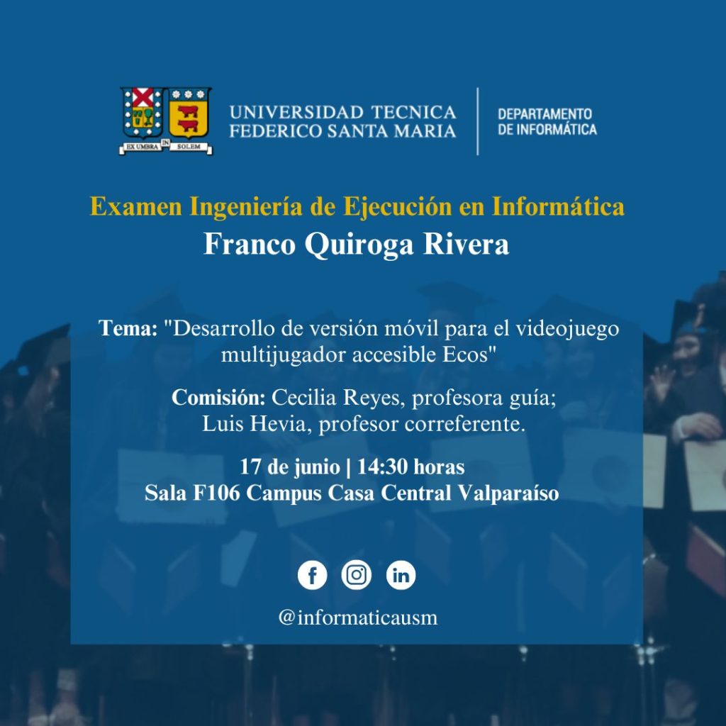 Se invita a presenciar el examen de título de Franco Quiroga Rivera, quien finaliza la carrera de Ingeniería de Ejecución en Informática con el tema de memoria “Desarrollo de versión móvil para el videojuego multijugador accesible Ecos”.