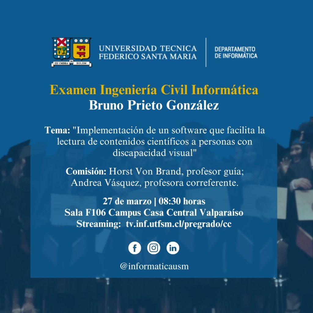 Se invita a presenciar el examen de título de Bruno Prieto González, quien finaliza la carrera de Ingeniería Civil Informática con el tema de memoria “Implementación de un software que facilita la lectura de contenidos científicos a personas con discapacidad visual”.