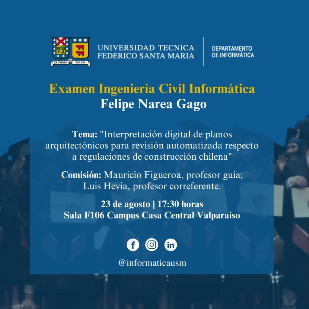 Se invita a presenciar el examen de título de Felipe Narea Gago, quien finaliza la carrera de Ingeniería Civil Informática con el tema de memoria “Interpretación digital de planos arquitectónicos para revisión automatizada respecto a regulaciones de construcción chilena”.