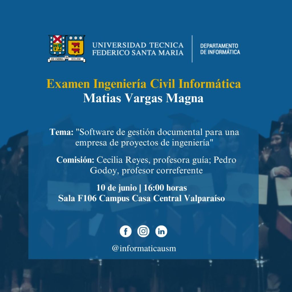 Se invita a presenciar el examen de título de Matías Vargas Magna, quien finaliza la carrera de Ingeniería Civil Informática con el tema de memoria “Preproducción de un juego de rol comercial inspirado en la saga Mega Man Battle Network según los estándares de instituciones gubernamentales”.