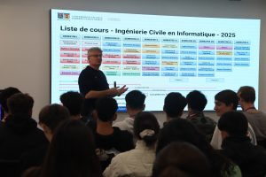El salón del edificio A de la Universidad Técnica Federico Santa María fue el punto de encuentro para 41 estudiantes de cuarto medio del Colegio Alianza Francesa de Viña del Mar y tres profesores. Su visita se concretó para participar de una jornada enfocada en ciberseguridad, a cargo de Xavier Bonnaire, profesor del Departamento de Informática.
