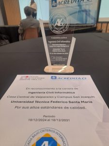 En el marco de la reciente certificación internacional obtenida por el Departamento de Informática de la Universidad Técnica Federico Santa María, por el periodo de máximo de siete años, Claudio Lobos, director del Departamento de Informática, asistió junto a José Luis Martí y Pedro Godoy, jefes de carrera, a la ceremonia de reconocimiento oficial de este mérito. El evento fue organizado por la agencia acreditadora del colegio de ingenieros de Chile (Acredita CI).